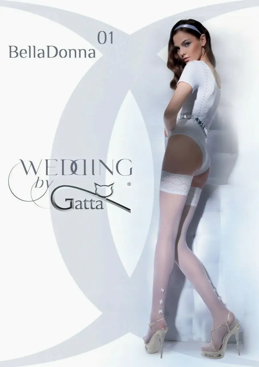ЧУЛКИ GATTA GT Пин Ап 01 WEDDING Свадебные прозрачные чулки с лайкрой, формованные, на кружевной силиконовой резинке с цветочным узором шириной 10 см, задняя часть голени украшена тремя бантиками с "жемчужинками". Размеры: 1/2 и 3 Цвета: off-white и bianco. Плотность: 20. Состав: полиамид Пин Ап эластан 18%.